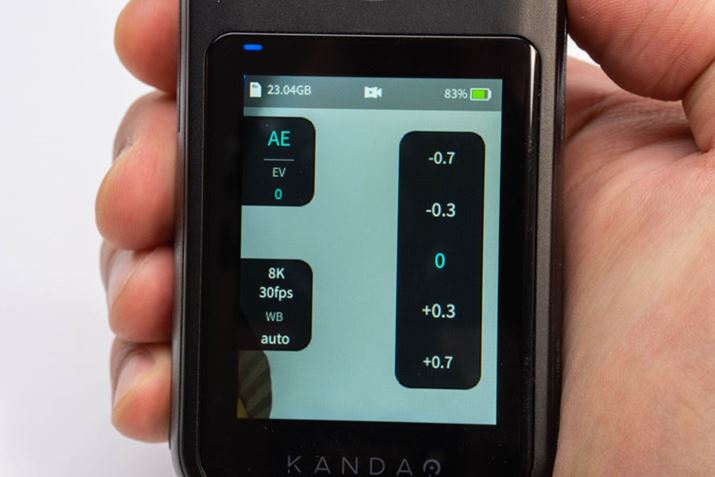 本体下部には2.4インチのタッチ対応ディスプレイを備えています。動画、写真、タイムラプスなどの撮影モードの切り替えや、解像度、フレームレート、ビット深度、絞り、ISOなどの設定が可能です