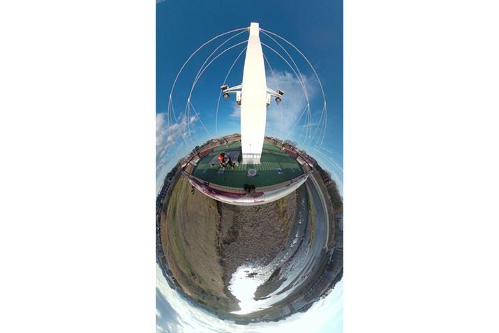 広角レンズのため、長さ160cmほどの自撮り棒の先に取り付けて撮影すると撮影者の全身までもがしっかり入ります。このまま360°映像として使用するほか、アプリで任意の場所を選んで16:9の動画として書き出すことも可能です