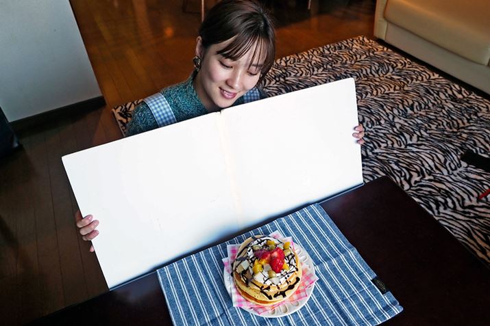 使い方はとっても簡単。レフ板で光を反射させるために、パンケーキが置かれた皿の側面に立てて設置するだけ。