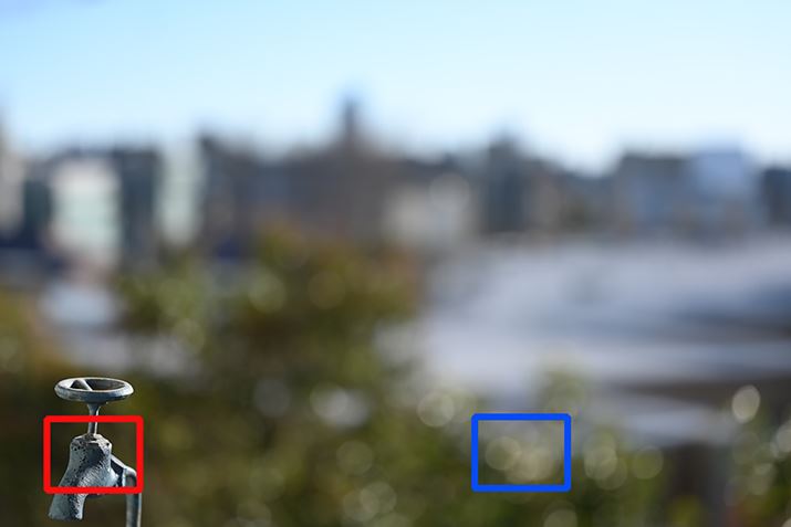 画像周辺に被写体を置いて、焦点距離70mm、AF-S NIKKOR 70-200mm f/2.8E FL ED VRの最短撮影距離(1.1m)付近で撮影。赤枠と青枠が切り出し部になる
