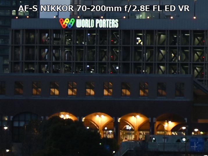 日没後の夜景を焦点距離70mmで撮影。ピントは画像中央の観覧車付近に合わせている。赤枠が切り出し部になる
