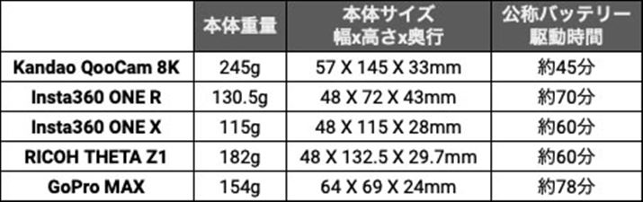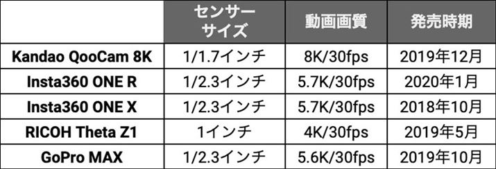 今回ピックアップしたのは、こちらの5モデル。驚異の8K/10bit撮影が可能なKandao「QooCam 8K」、分離合体機構を備えアクションカメラにもなるShenzhen Arashi Vision 「Insta360 ONE R ツイン版」、同じくShenzhen Arashi Vision製で価格と性能のバランスに優れた「Insta360 ONE X」、1インチセンサー搭載のリコー「THETA Z1」、ケースなししでも防水性能を備えるGoPro「MAX」という実力派かつ個性的な製品をピックアップしています。