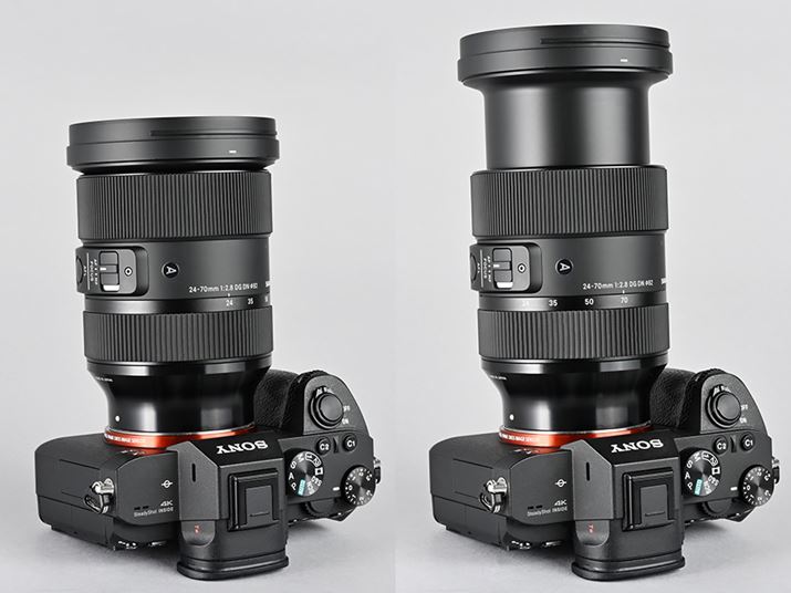 左が広角端24mm、右が望遠端70mm。ズームリングの回転方向は純正のソニーEマウントレンズとは逆になっている
