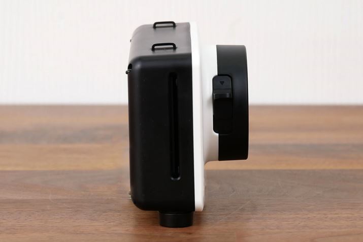 レンズの焦点距離は45.5mm(35mm換算25.5mm)とやや広角で、絞り値はF11。適正撮影距離は0.5〜1m、フラッシュ有効範囲は0.5〜0.8mとなっている。レンズが広角なので、2〜3人でのセルフィ―も楽しむことができ、レンズの下にセルフィ―用のミラーを装備する