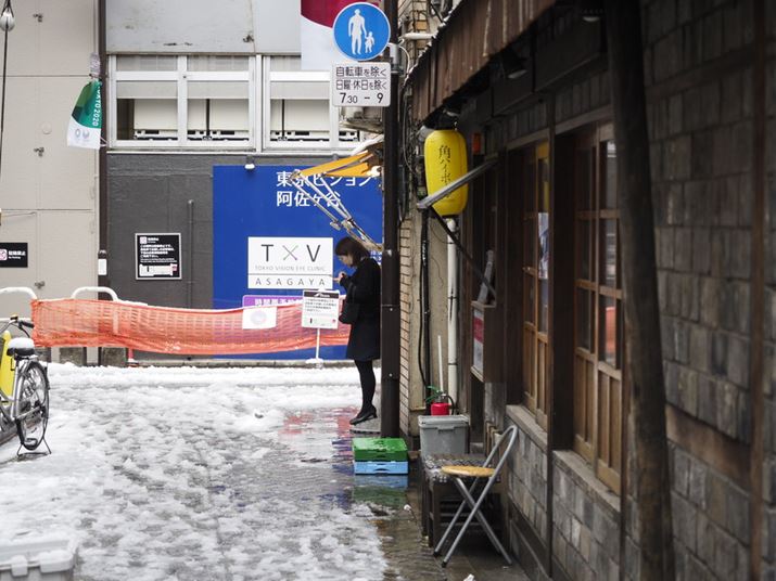軒下での雨宿り、いや雪宿りか、手前の居酒屋のボケ感が絞りF2.8の片鱗を物語る