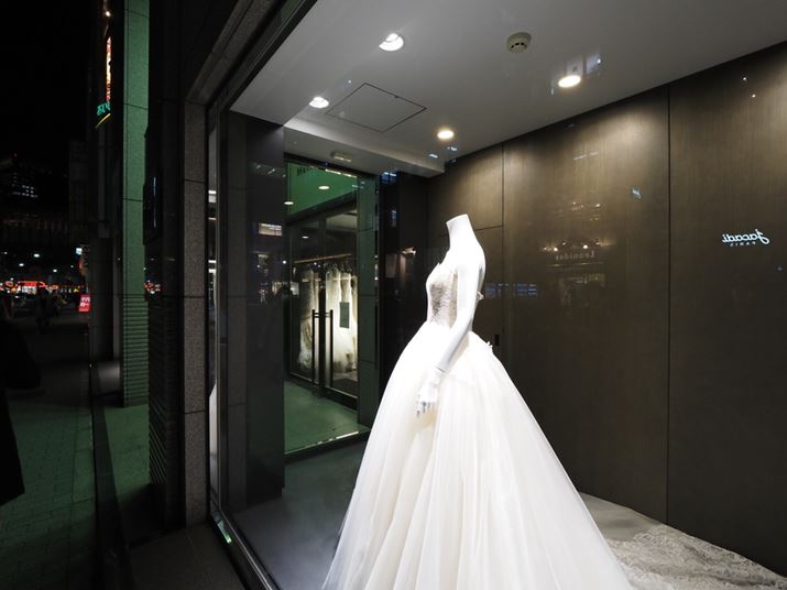 18時45分を過ぎてかなり暗くなった。ライトアップされた白いドレス。レースの模様が白飛びせずに再現されている。暗い屋外の看板の文字もしっかり読み取れる