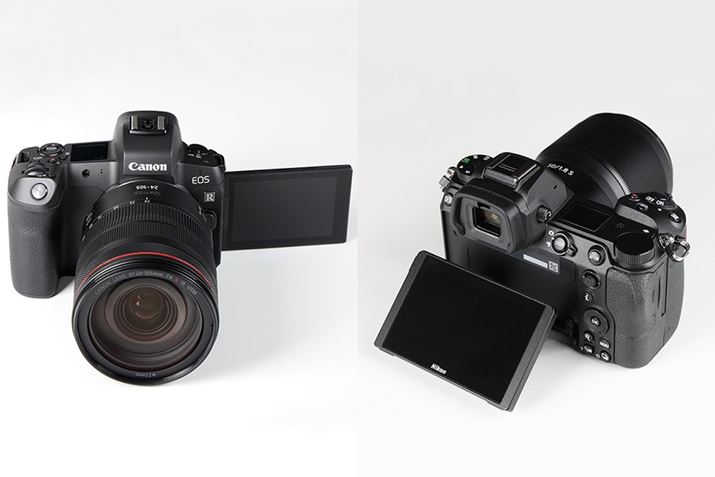 左がバリアングル式を採用するキヤノンのフルサイズミラーレス「EOS R」、右がチルト式を採用するニコンのフルサイズミラーレス「Z 6」