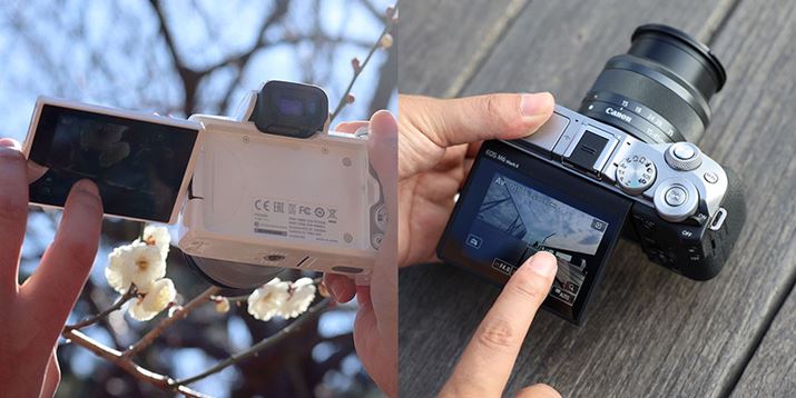 モニターをくるっと回転させて自分撮りに対応できるのもバリアングル式のメリット。画像はキヤノンのAPS-Cミラーレス「EOS Kiss M」