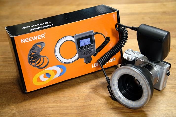 後編で使用する製品1つ目は、一眼レンズカメラ用の接写専用ストロボLED。今回使用したのはNEEWER社のLED48球タイプのものになります。