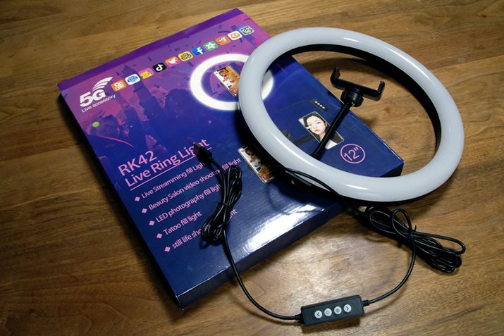 USB給電のドーナツ型のLEDリングライト(直径30センチ)。今回は、上海問屋さんのものを使用しました。