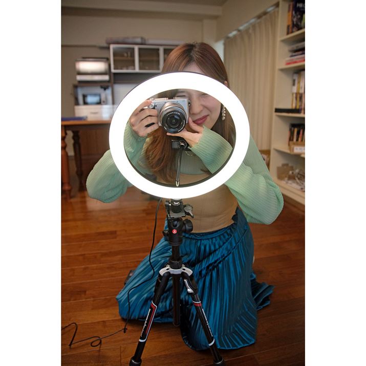 スマートフォン用ホルダーが付いていて便利ですが、今回はこのようにリングライトを三脚で固定してセッティング、ミラーレスカメラをリングの中に入れて撮影してみました。