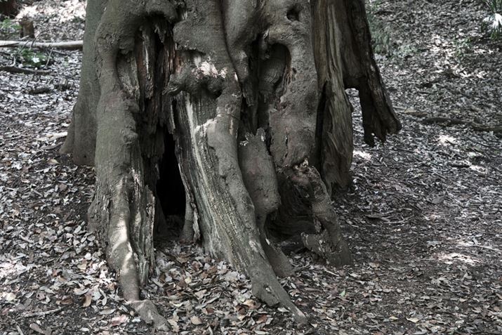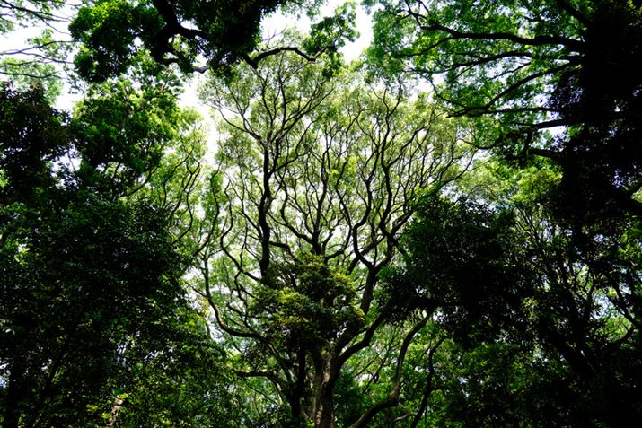 明治神宮の林、空を見上げると重ならないように枝が伸びていた