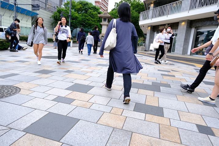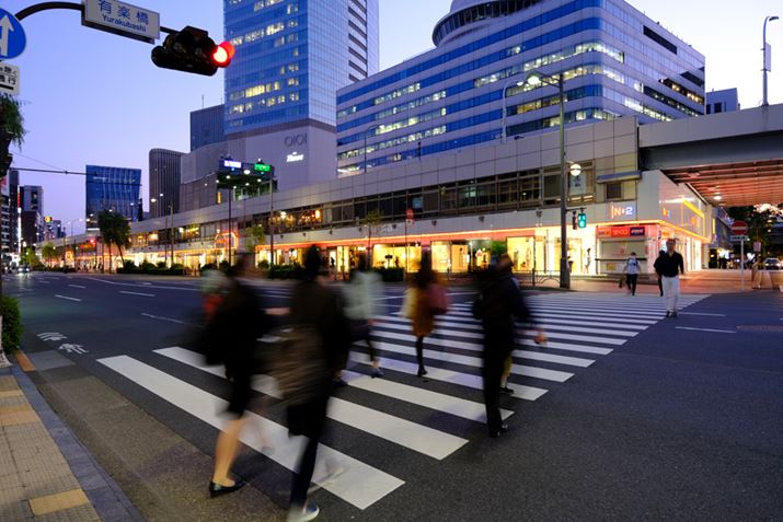 有楽町の交差点で家路を急ぐ人々、レンズとカメラの手ブレ補正機能でブレ知らず