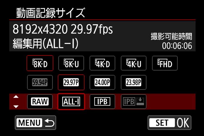 8K DCI/30p、8K UHD/30pでの8K動画撮影を実現。8K DCIではRAW記録も可能だ。MP4の記録モードとしてALL-IとIPBが用意されている