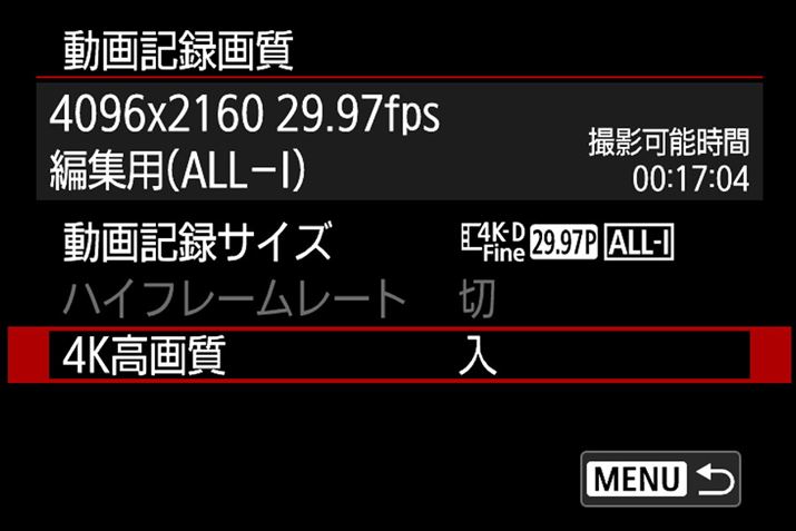 動画記録画質のメニューから「4K高画質」を選択すると、8.2Kオーバーサンプリングによる4K記録(30pもしくは24p)が行える