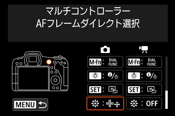 操作ボタンのカスタマイズ設定でマルチコントローラーに「AFフレームダイレクト選択」を割り当てると、マルチコントローラーでAFフレームをダイレクトに移動できるようになる