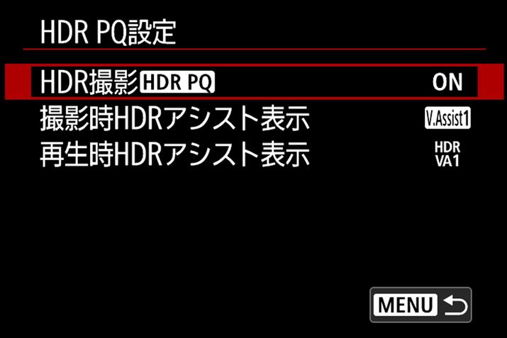 広階調・広色域のHDR PQ記録に対応。モニターはHDR画像の表示に対応していないため、アシスト表示機能として「V.Assist1(中間輝度露出確認用)」と「V.Assist2(高輝度描画確認用)」が用意されている