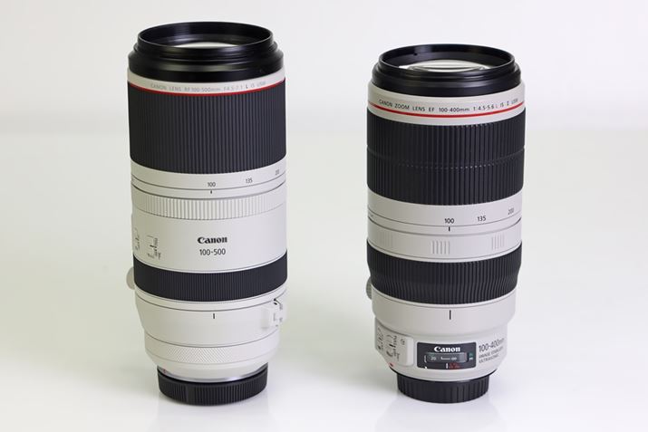 左がRF100-500mm F4.5-7.1 L IS USMで、右がEF100-400mm F4.5-5.6L IS II USM。RF100-500mm F4.5-7.1 L IS USMは望遠端が500mmまで伸びているが、ほぼ同等のサイズ感を実現。重量は約200g軽くなっている