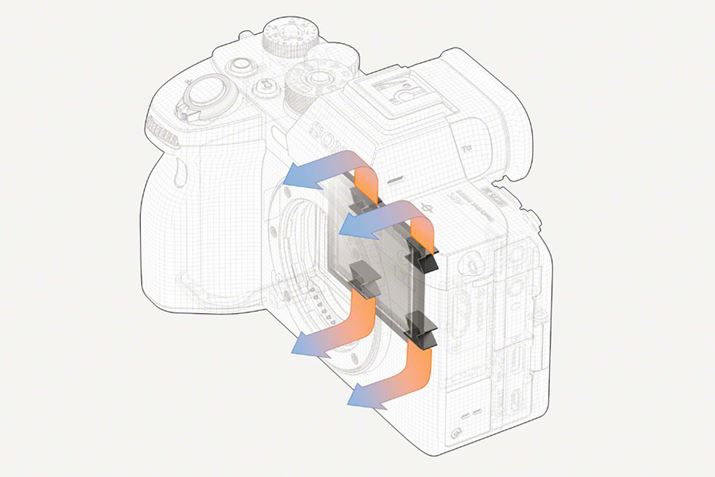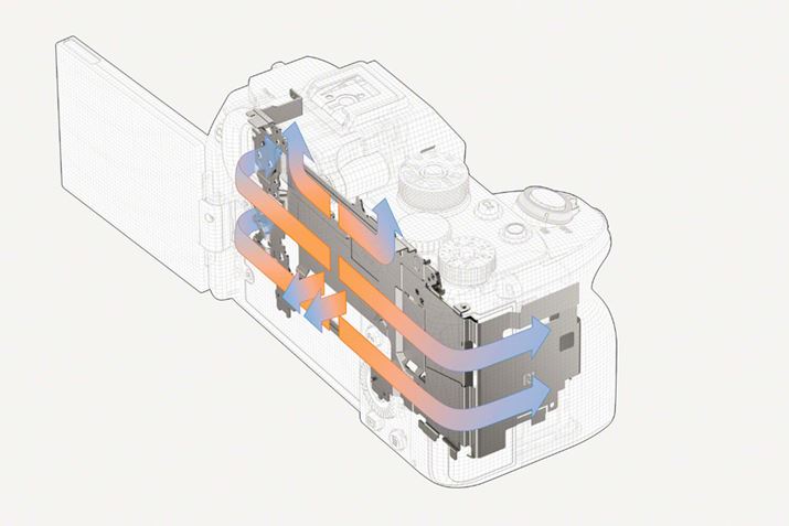 放熱経路を最適化することで、小型軽量ボディと放熱性能を両立している。これにより、最大1時間の4K/60p動画記録を実現。なお、連続動画撮影時間は記録方式や記録設定、メモリーカード、温度環境、バッテリー充電状態により変動するという