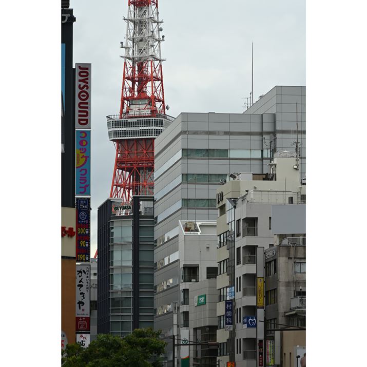 下の作例は少し位置を変えて、望遠端200mmで切り取るような感覚で撮っています。画面左側に看板などを入れて奥の建物(六本木ヒルズ)を隠すことで、奥行き感を出しつつ視線が東京タワーに行くようにしてみました。手持ちですが、手ブレ補正が強力なのでしっかりとフレーミングして水平を出すことができました。ピントは一番奥の東京タワーに合わせていますが、鉄骨の細かいところまでしっかりと描写できています。