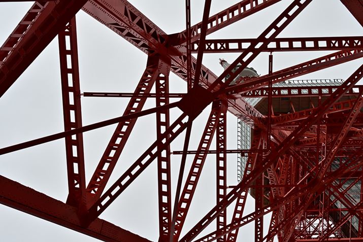 東京タワーを被写体にしての撮影は、鉄骨の形やパターンを生かして撮れるのが面白いところです。この作例は、鉄骨の内側から標準域(焦点距離48mm)で撮っています。