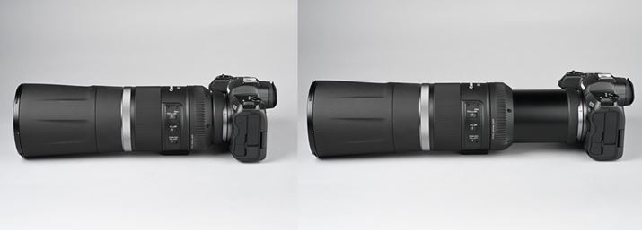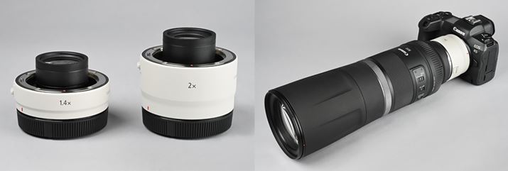 別売のエクステンダーEXTENDER RF1.4×/RF2×に対応。EXTENDER RF2×装着時(画像右)は1600mmにまで焦点距離が伸びます