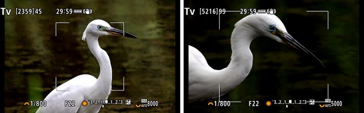 左がフル画角、右が約1.6倍クロップ(APS-Cクロップ)での撮影画面。約1.6倍クロップ時はAFエリアがひと回り広くなり、AF撮影がさらにやりやすくなります。なお、撮影画面はEXTENDER RF2×装着状態で絞り値がF22になっていますが、エクステンダー装着時でも対応するAFエリアは変わりません