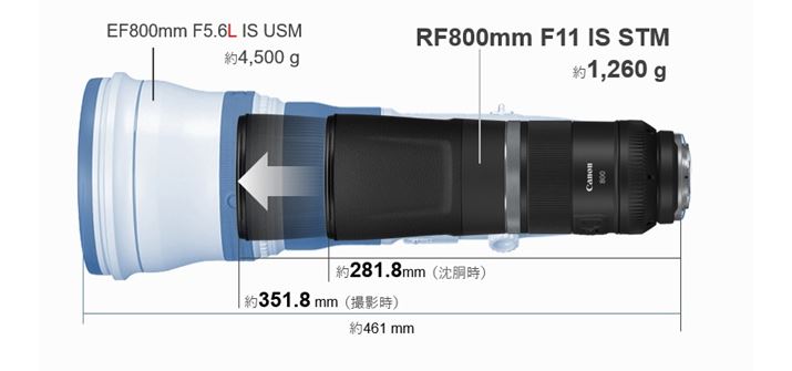 RF800mm F11 IS STMと、一眼レフ用の超望遠レンズ「EF800mm F5.6L IS USM」のサイズを比較したイメージ。スペックが異なっているとはいえ、RF800mm F11 IS STMは約70%も軽量化されています