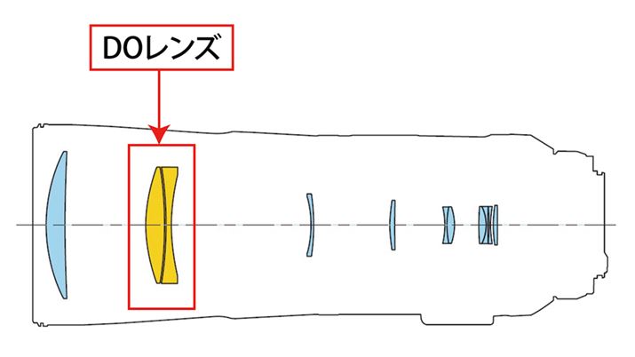 レンズ構成は超望遠レンズとしてはシンプルな8群11枚。色収差補正効果と非球面レンズの特性を併せ持つDOレンズを前方に配置しています。最短撮影距離は6.0m(最大撮影倍率0.14倍)