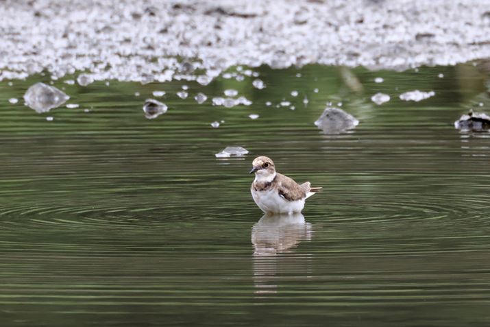 EXTENDER RF2×に約1.6倍クロップ(APS-Cクロップ)の組み合わせで、遠くにいるコチドリ(距離40m程度)を撮影。水浴びをしている様子を連写したものの中から、動きが止まった瞬間の1枚をピックアップしました。上に掲載したアオアシシギの作例と同様、コントラストが低い状況だったのでRAW現像で仕上げています。