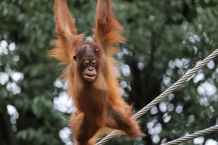 ロープを伝って移動するオランウータンの動きが止まったときに1/250秒でシャッターを切りました。毛の1本1本まで描写できています。
