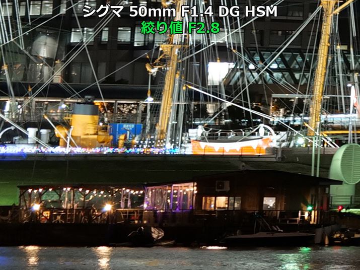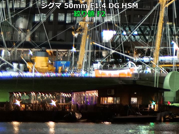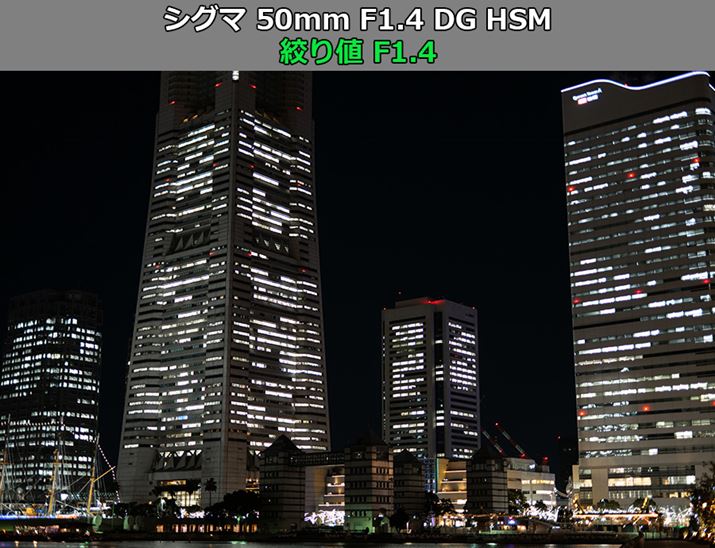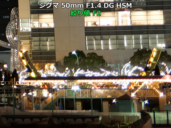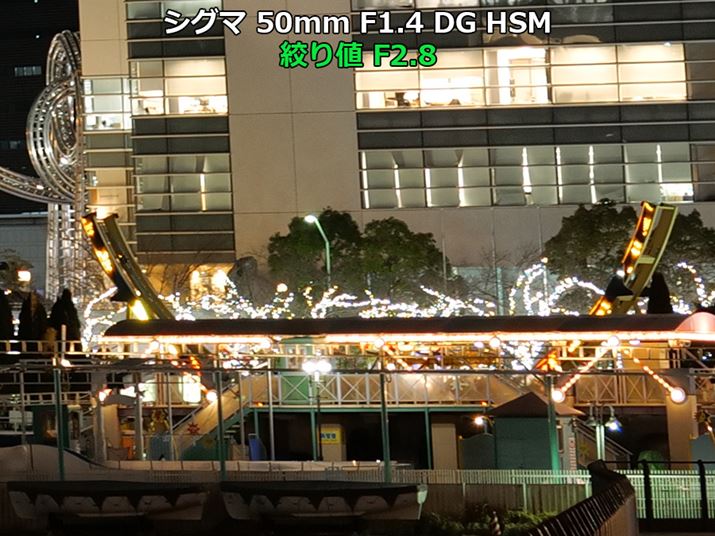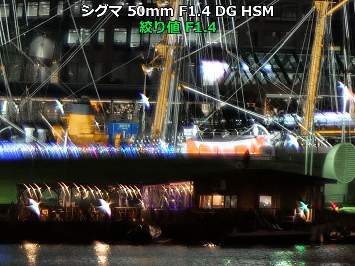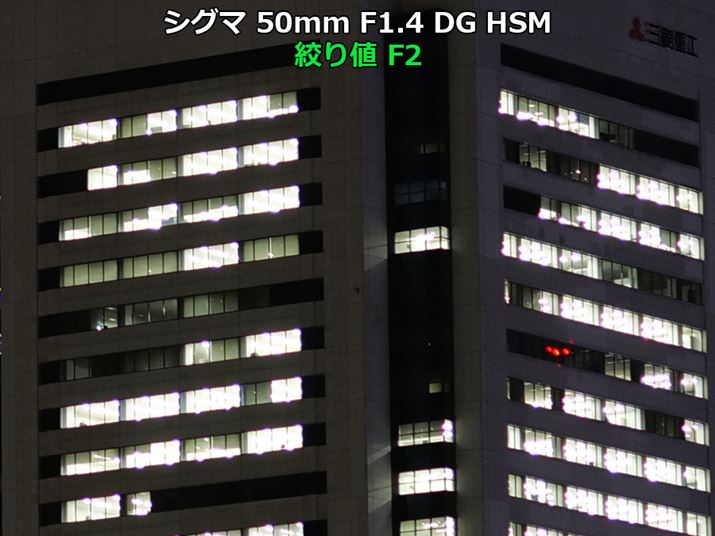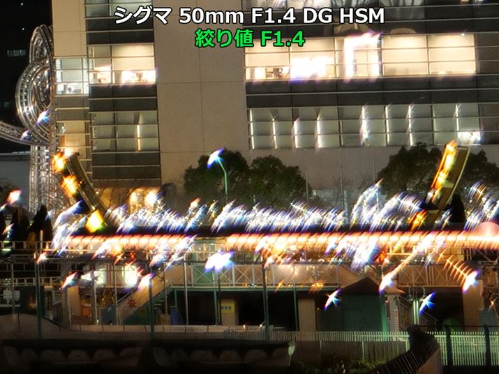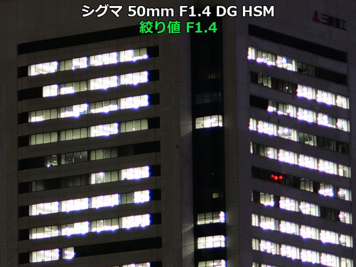 ・50mm F1.4 DG HSM+S1Rはこのテストでは厳しい結果となった。F1.4では画像中央の光源付近に目立つフリンジが発生している。