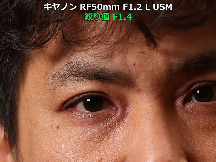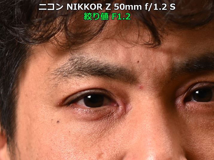 状況:真っ暗な屋内で外部フラッシュ2灯(Profoto B2)を使用。ストロボは同じ位置かつ同じ光量にして、感度で露出を調整。キヤノンとニコンのF1.2作例についてはストロボの光量を1/3段落とした。ピント合わせは瞳AFを利用