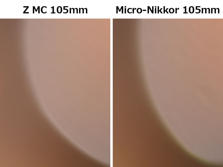 上記の結果を見ると、NIKKOR Z MC 105mm f/2.8 VR Sは色収差を徹底的に抑えていて、すぐれた解像力を持っていることがわかるはずです。AF-S VR Micro-Nikkor 105mm f/2.8G IF-EDは、絞り開放時だけでなくある程度絞った状態でも輪郭にわずかな色付きが残りますが、NIKKOR Z MC 105mm f/2.8 VR Sではそういったことはありません。絞り開放の等倍撮影でも、ピント面の前後で軸上色収差がほとんど発生していないくらいです。ディテールの再現性が重要なマクロ写真を撮るうえで、この色収差の少なさと解像力の高さは魅力的です。