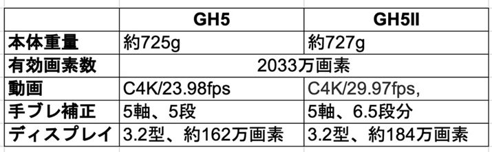 基本スペックを見ると、やはり大きく進化したのは手ブレ補正とディスプレイの解像度ですね。なお、本体サイズは「GH5」「GH5II」ともに横138.5×縦98.1×奥行き87.4mmとなっています。本体重量には、本体、バッテリー、メモリーカード1枚含んでいます。