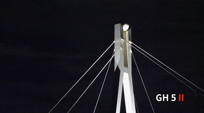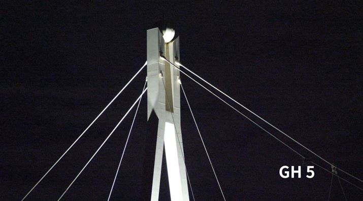 以下が「GH5」で夜間に橋を撮影した映像です。スクリーンショットでも、細いロープの部分のディテールが少しボヤけていることがわかると思います。また、元データを大画面で見ると、空の部分にもノイズが発生していたことが確認できました。
