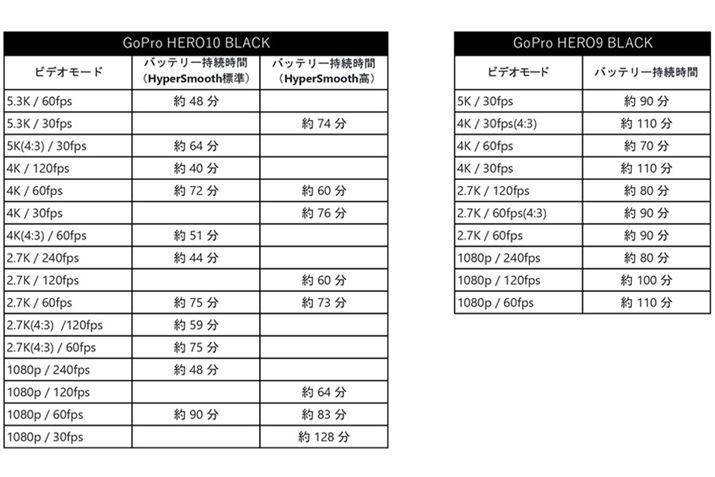 事前に気をつけなくてはならないのは、バッテリーの持続時間です。参考までに、最新モデルのHERO10 BLACKと、ひとつ前のモデルのHERO9 BLACKのバッテリー持続時間を掲載します。