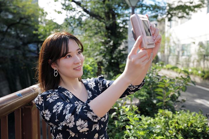 それではさっそく、撮影していきましょう。まずは、スタンダードに、手持ち自撮りから。