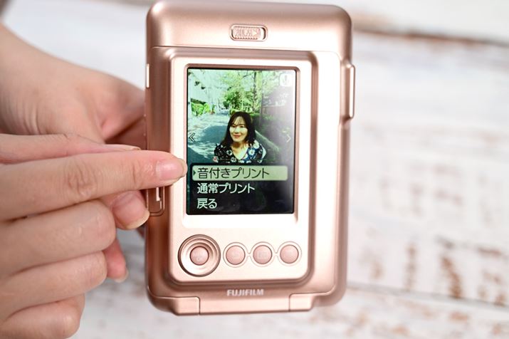 そのまま、声をカメラに向けて吹き込んで(最長10秒間まで)、録音終了後にメニューから「音付きプリント」を選択すると…