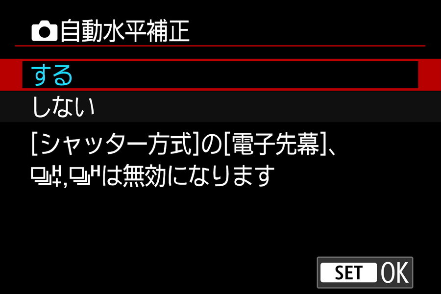 「自動水平機能」の設定画面。電子先幕時や高速連続撮影時は無効になる