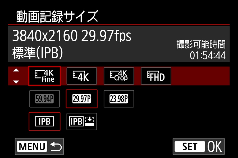 動画記録サイズの設定画面。4K UHD Fine/30p、4K UHD/60p、4K UHDクロップ/60pといった記録に対応している。フルHDはハイフレームレート設定時に120p記録が可能だ