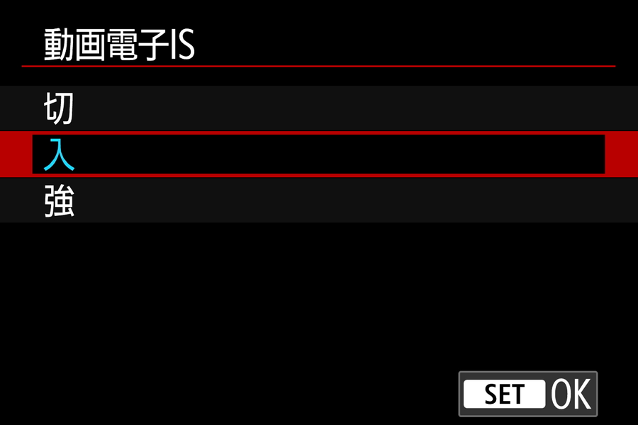画角は狭くなるものの周辺のブレ補正に有効な「動画電子IS」も備わっている。より強力な補正の「強」も選べる