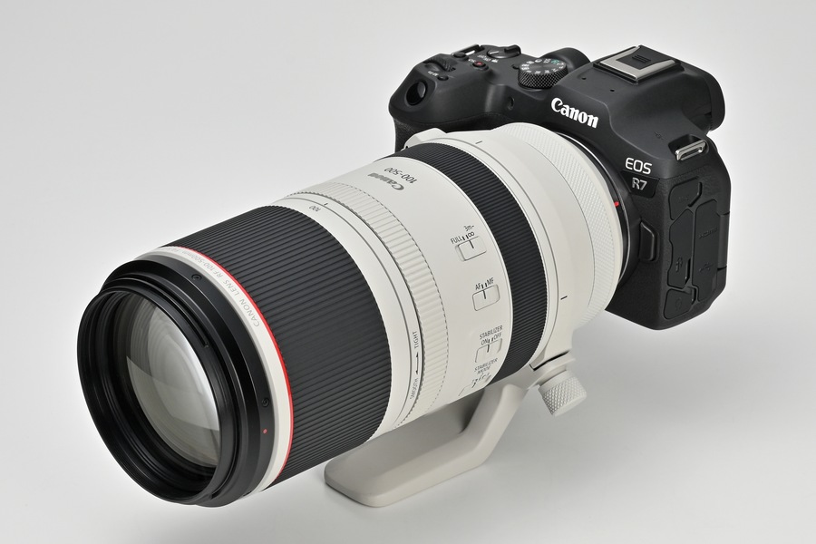 超望遠ズームレンズ「RF100-500mm F4.5-7.1 L IS USM」を装着したイメージ。「EOS R7」との組み合わせでは、35mm判換算で焦点距離160〜800mm相当の画角をカバーするようになる