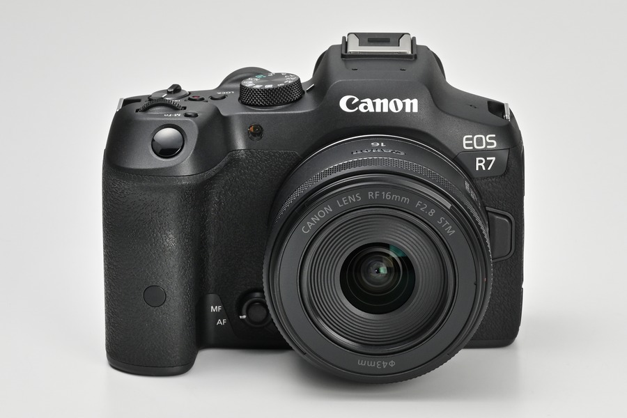 小型・軽量な「RF16mm F2.8 STM」を装着したイメージ。「EOS R7」に装着すると焦点距離26mm相当の広角・単焦点レンズとなる