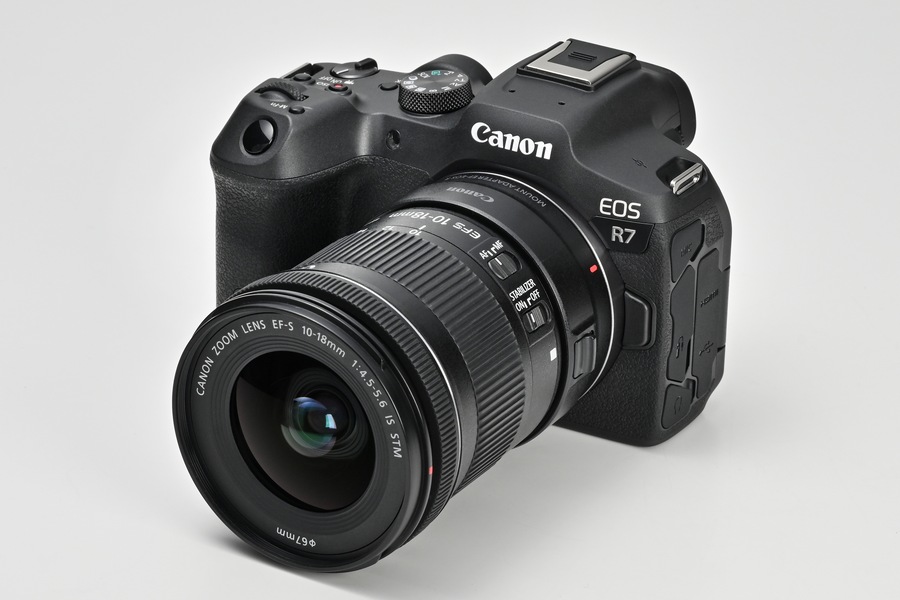 純正のマウントアダプターを介して、一眼レフ用の「EFレンズ」を装着できる。この画像では、EF-Sマウントの超広角ズームレンズ「EF-S10-18mm F4.5-5.6 IS STM」を装着している