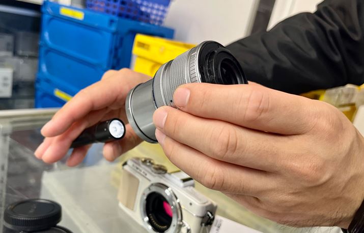 フジヤカメラは検品の際にこうしてライトを使い、レンズ内部にホコリや汚れ、カビや傷がないかチェックしているそう。