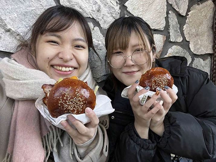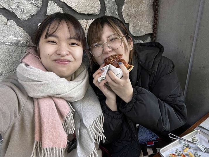 撮影現場は、「写ルンです」が爆発的にヒットした当時のギャルの本場、東京・渋谷です。まずは渋谷のハンバーガー屋さんで「iPhone」を使ってスナップ(自撮りも含む)。SNSでよく見かけるような、おなじみの絵だと思います。