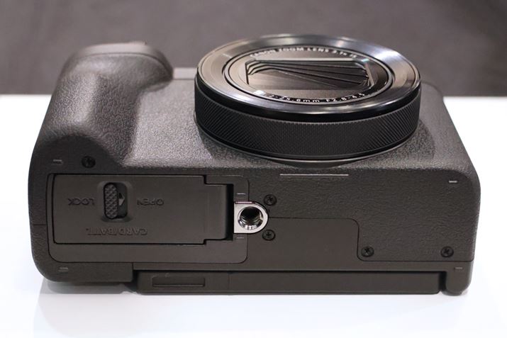 「PowerShot V1」のサイズは約118.3(幅)×68.0(高さ)×52.5(奥行)mmで、重量は約426g(バッテリーおよびメモリーカードを含む)。「PowerShot G7 X Mark III」と比べるとひとまわり大きくて重いボディだが、1.4型センサーや、35mm判換算で焦点距離約16mmスタートの超広角ズームレンズ、冷却ファンを搭載していることを考慮するとコンパクトに収まっている。