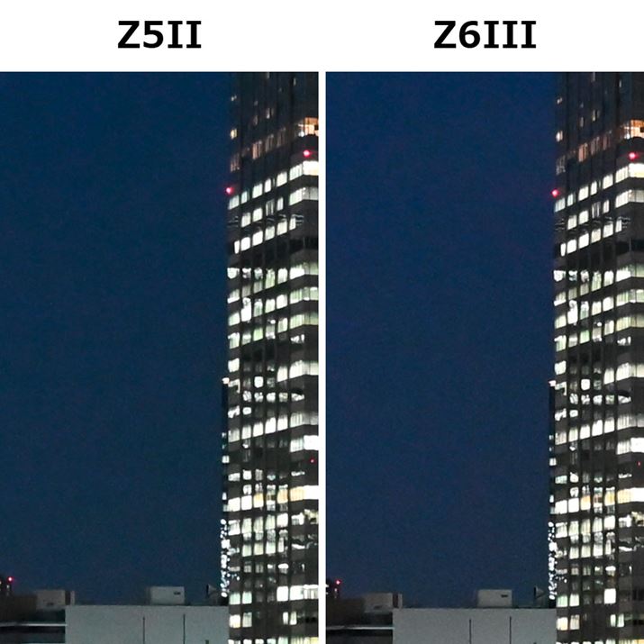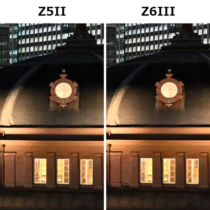 ISO6400の高感度で夜景を撮影してみた。等倍切り出し画像を見ると、ごくわずかに「Z5II」のほうがノイズ(特に暗部ノイズ)が少ないように見える。