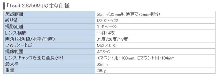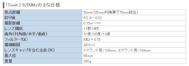 なお、「Touit 2.8/50M」は、2014年5月30日時点で、Xマウント用としては唯一の「等倍マクロレンズ」となっている。富士フイルムのミラーレス一眼カメラ「Xシリーズ」で本格的なマクロ撮影を楽しみたいのなら、選択肢に入れてほしい製品である。